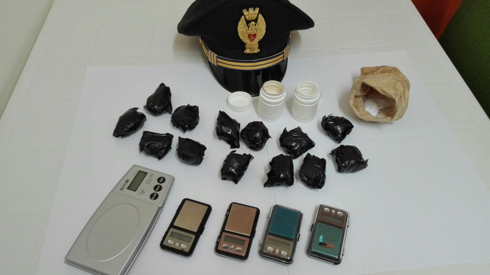 Il fiuto del cane della Polizia ha permesso di sequestrare un importante quantitativo di sostanza stupefacente del tipo cocaina e eroina circa 400 grammi più sostanza da taglio (mannite) e 5 bilancini di precisione.