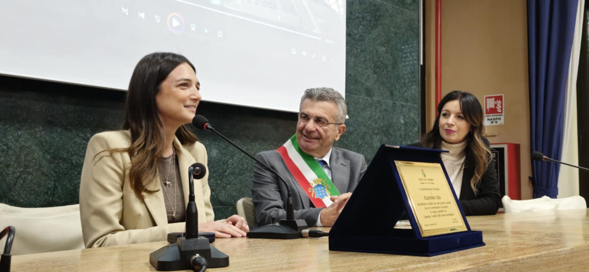 Sulla targa la seguente scritta: “l’Amministrazione a Claudia Cea, straordinario modello per tanti giovani cassinati, che con avveniristiche innovazioni in campo scientifico, ha spostato i confini della ricerca scientifica”.