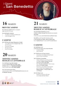Il Corteo storico Terra Sancti Benedicti sarà presente nel pomeriggio del 21 marzo per accompagnare la reliquia del Santo presso la Chiesa concattedrale di Cassino per la solenne celebrazione presieduta da Sua Eminenza Rev. il Cardinale Giuseppe Petrocchi, Arcivescovo emerito dell’Aquila e concelebrata da sua Eccellenza Rev.ma Gerardo Antonazzo della diocesi di Sora Cassino Aquino Pontecorvo insieme a sua Ecc.Rev. ma Dom Luca Fallica, Arciabate di Montecassino.