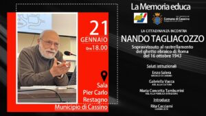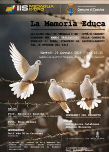 Non c’è alcun dubbio: la Memoria educa, come recita il titolo del progetto dell’IIS Medaglia d’Oro di Cassino. E quando i giovani vengono posti al centro di un’iniziativa, educa ancora di più. Ne avremo prova martedì 21 gennaio 2025. Nell’auditorium della scuola, messo a disposizione dal dirigente scolastico prof. Marcello Bianchi, gli alunni delle classi 1D 3D 4D e una folta delegazione degli studenti delle scuole secondarie di primo grado, dialogheranno con Nando Tagliacozzo. E’ uno dei pochi sopravvissuti al rastrellamento del ghetto di Roma il 16 ottobre 1943. Quando era solo un bimbetto di 5 anni. Con lui si parlerà di leggi razziali e di valore della memoria, tanto più importante in questo periodo storico.