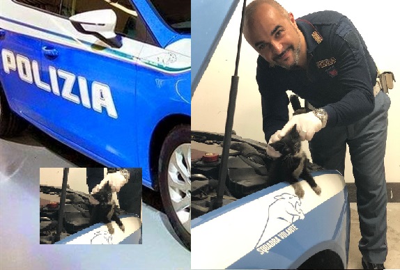 Gattino resta incastrato nel vano motore di una “pantera” della polizia; salvato grazie agli agenti che hanno sentito il suo miagolio.