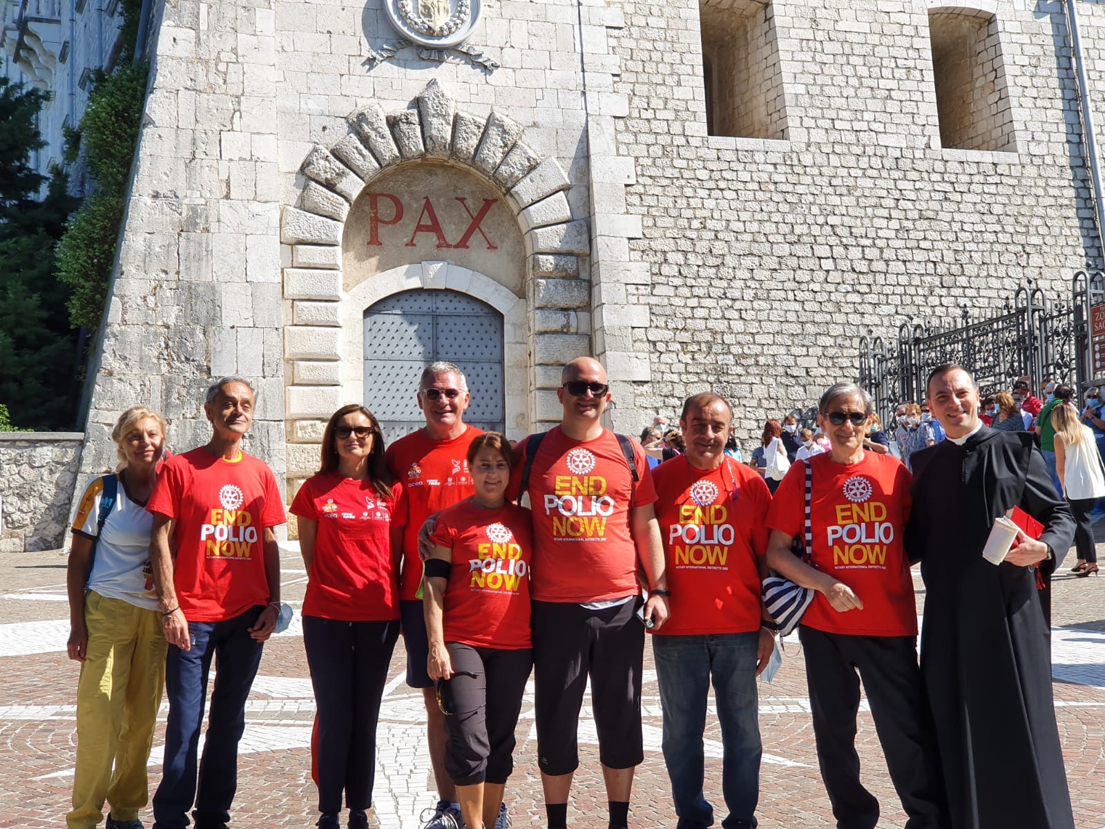 Dopo due brevi soste al Monastero di Santa Maria della Rupe nei pressi della Casa del Santo Patriarca, il gruppo è arrivato in Abbazia, attraversando la “Porta della Pace” ed è stato accolto da S. E. Rev.ma Padre Abate Dom Donato Ogliari, Socio Onorario del Rotary Club di Cassino, recentemente insignito della prestigiosa onorificenza rotaryana “Paul Harris Fellow”. La giornata si è conclusa con la celebrazione del Solenne Pontificale all’interno della Basilica Cattedrale.