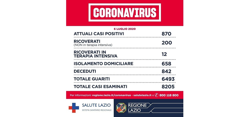 Per quanto riguarda il bilancio generale Covid nella Regione Lazio, sono 870 gli attuali casi positivi #COVID19 nella Regione Lazio. Di cui 658 sono in isolamento domiciliare, 200 sono ricoverati non in terapia intensiva, 12 sono ricoverati in terapia intensiva. 842 sono i pazienti deceduti e 6493 le persone guarite. In totale sono stati esaminati 8205 casi.