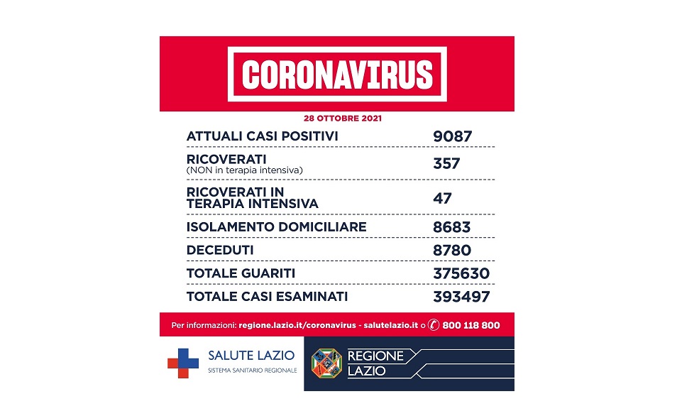 Nelle ultime 24 ore, nel Lazio su un totale di 32.694 tamponi, sono stati registrati 594 nuovi casi positivi (+91), 5 i decessi ( = ), 357 i ricoverati (-5), 47 le terapie intensive ( = ) e 350 i guariti.