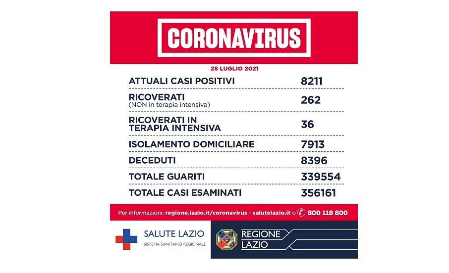 Asl Roma 1: 206 nuovi casi e 1 decesso; Asl Roma 2: 106 nuovi casi; Asl Roma 3: 89 nuovi casi; Asl Roma 4: 93 nuovi casi; Asl Roma 5: 28 nuovi casi; Asl Roma 6: 78 nuovi casi.