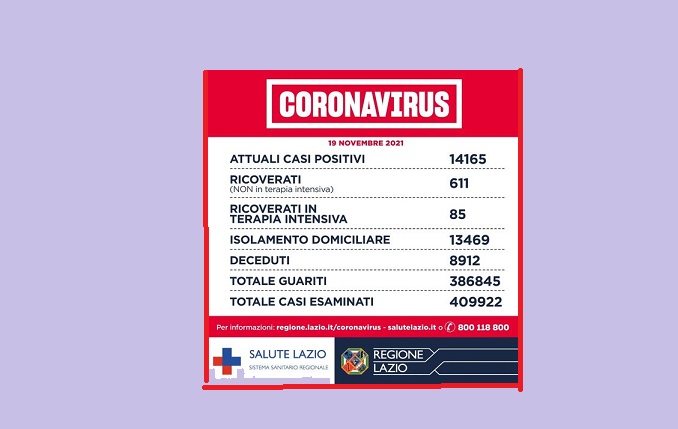 Nelle ultime 24 ore, nel Lazio, su un totale di 45.242 tamponi, si registrano 1.229 nuovi casi positivi (+140), 4 decessi (-2), 611 ricoverati (+5), 85 ricoverati in terapia intensiva (+4) e 709 guariti.