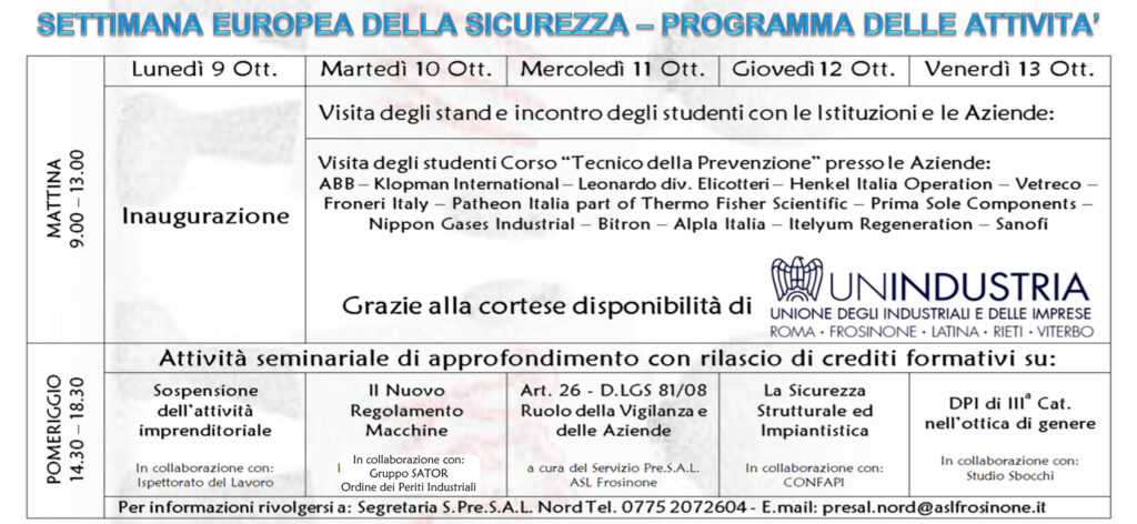 Si torna in presenza, si torna a parlare di sicurezza con le scuole e con le aziende. L’Asl di Frosinone è pronta, il programma definitivo è stabilito da tempo. Al via il 9 ottobre, con un percorso di eventi e attività che si estenderà fino al 13 ottobre 2023, la XVII Settimana della Sicurezza, il consueto appuntamento della Campagna Europea coordinata dall’Agenzia Europea per la Sicurezza e la Salute sul Lavoro e dai suoi partner nei 27 Stati membri dell’Unione Europea, occasione unica per una proficua integrazione con il Piano Regionale di Prevenzione.