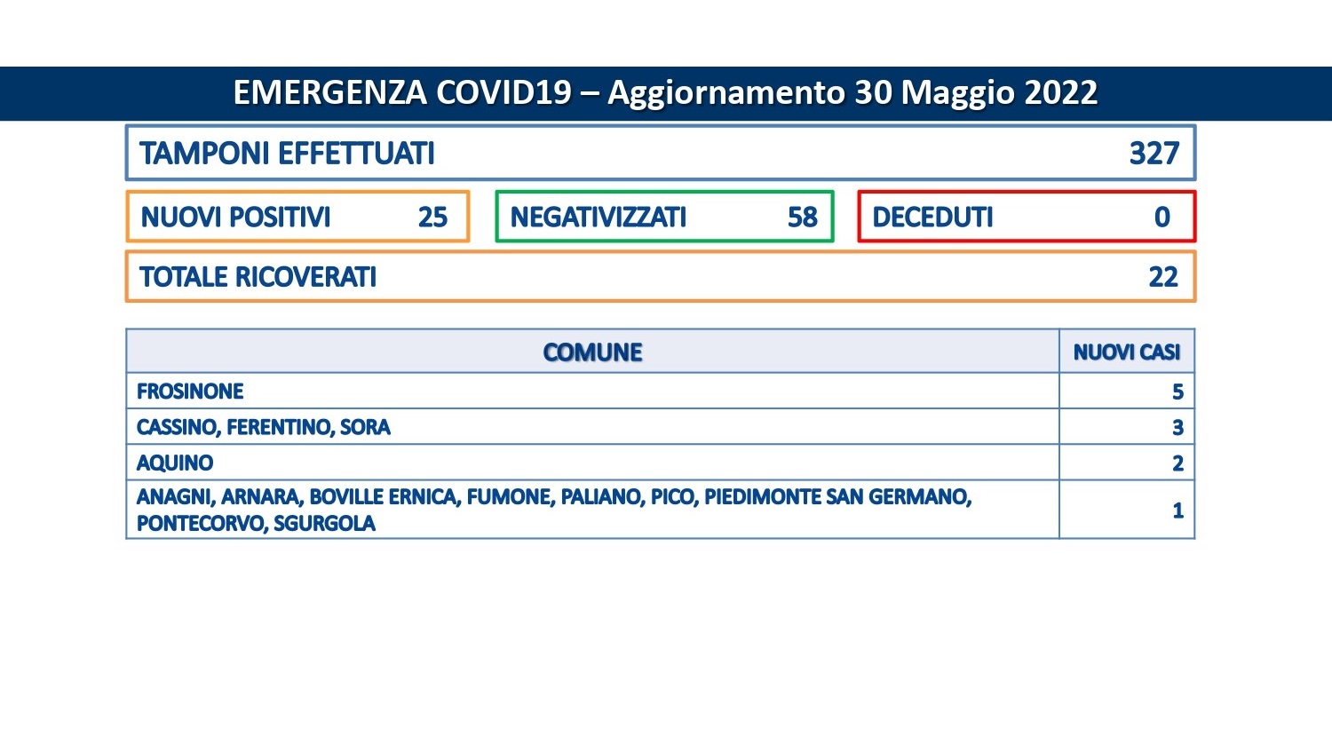 I ricoveri sono stabili (22), non sono stati registrati decessi e migliora anche il rapporto tra i positivi (25) e i tamponi (327), pari ad un positivo ogni 13,8 tamponi processati.