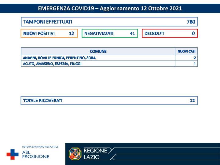 I dati relativi alle ultime 24 ore in provincia di Frosinone, a fronte di 780 tamponi processati, evidenziano 12 nuovi casi di positivi al SARS-CoV-2, 41 negativizzati.