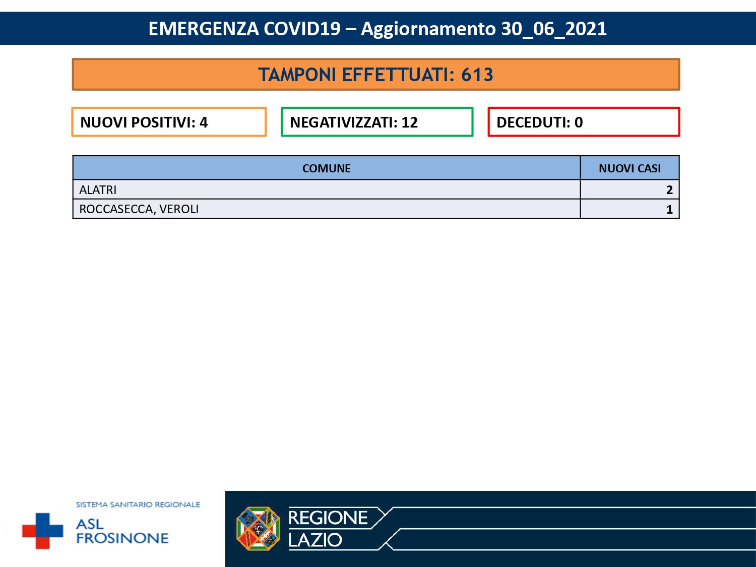 Nelle ultime 24 ore, in provincia di Frosinone, sono stati processati 613 tamponi che hanno fatto registrare 4 nuovi casi di positivi al Sars-CoV-2.