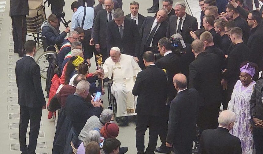 La Fiaccola benedettina ‘Pro pace et Europa una’ è arrivata in Vaticano e durante l’udienza in Aula Nervi è stata benedetta da Papa Francesco, prima di visitare le tombe di San Pietro e dei papi Benedetto XVI e Paolo VI.