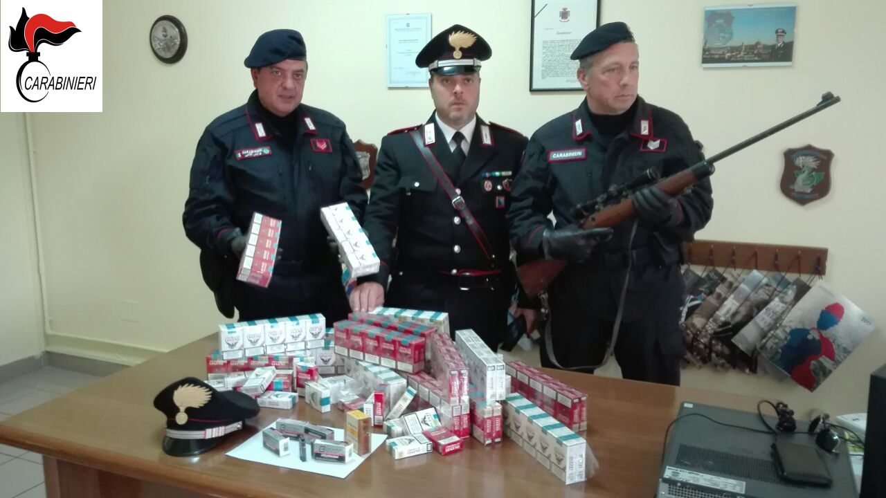 La successiva perquisizione dei locali consentiva il rinvenimento di oltre 4 kg di sigarette di varie marche, prive del sigillo del Monopolio di Stato, ma anche di una carabina Cal. 22, senza marca e con matricola non censita in banca dati, e 222 cartucce dello stesso calibro.